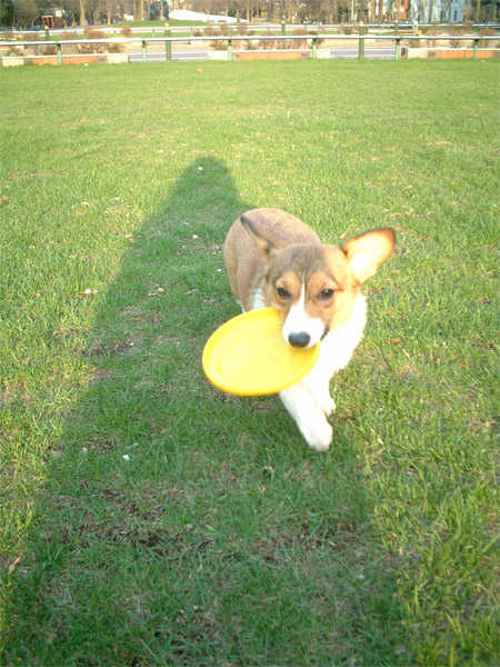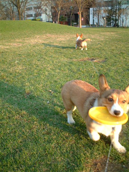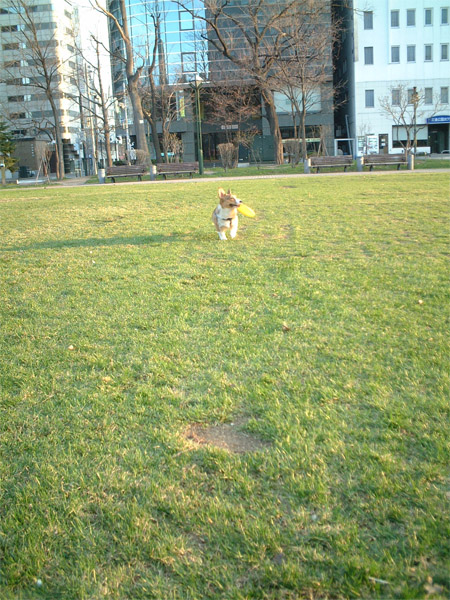 伸び伸びと、走り回りディスクを取りに行くmoof。