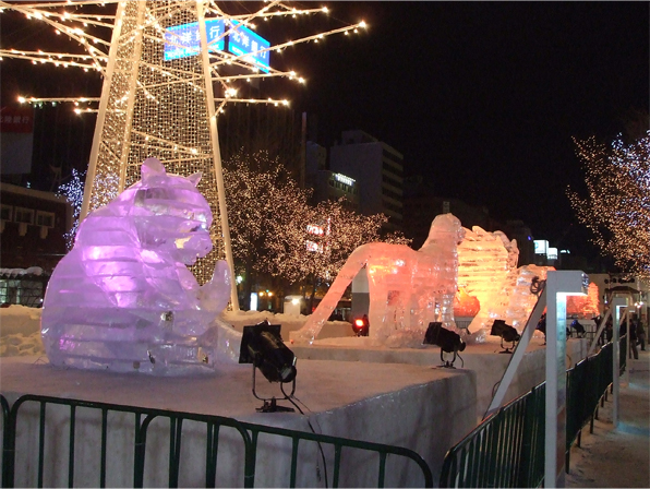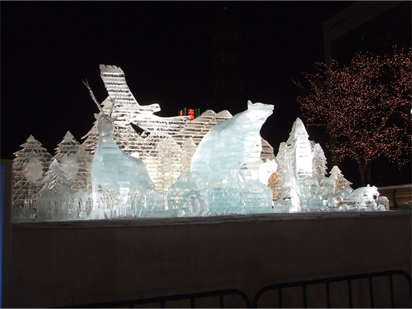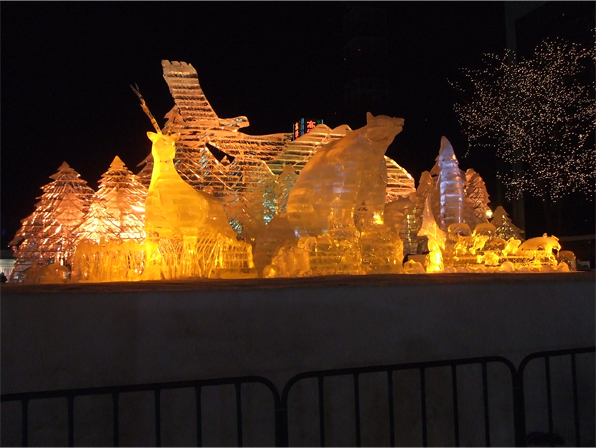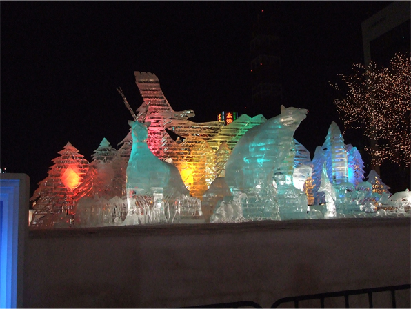 氷の氷像は、照明が綺麗ですね〜