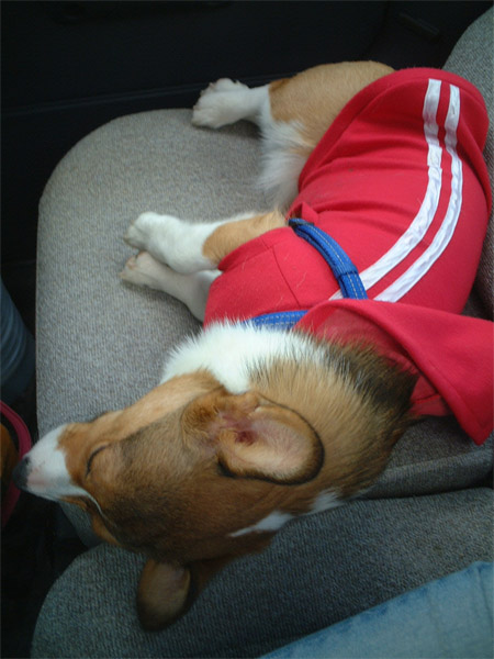 沢山遊んで、帰りの車では珍しく横になるmoof。