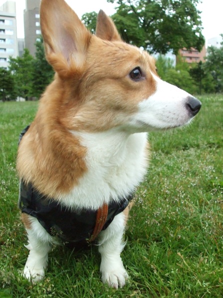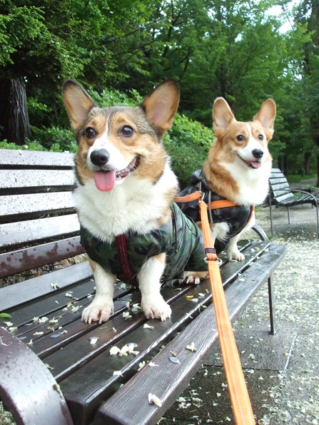 お手製のレインコート着てお散歩。