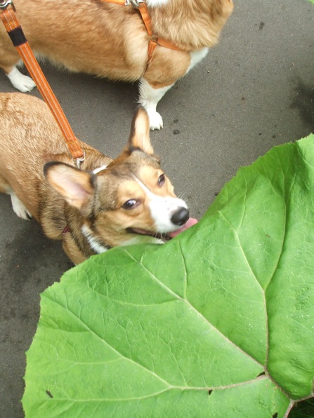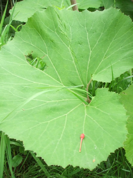 大きな蕗に上から落ちた木の実。